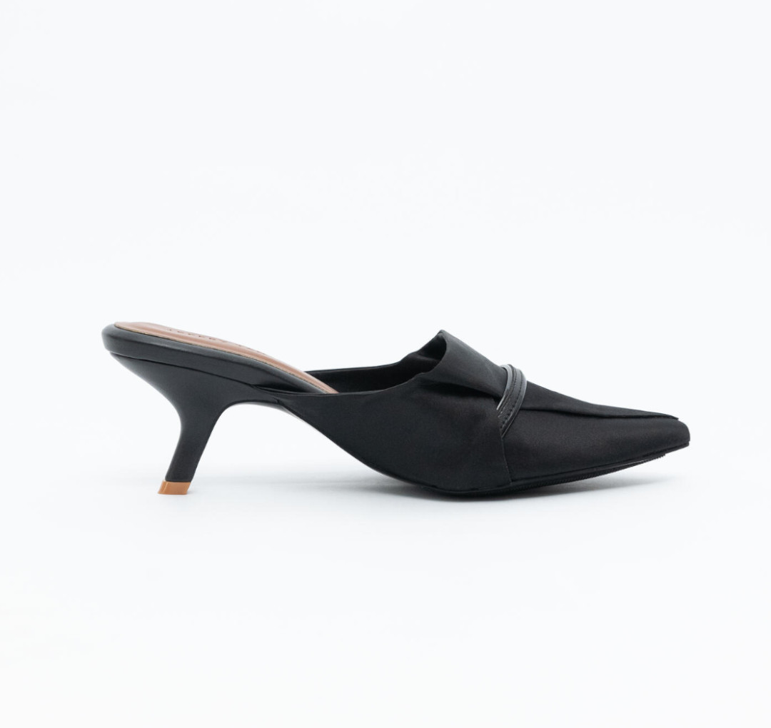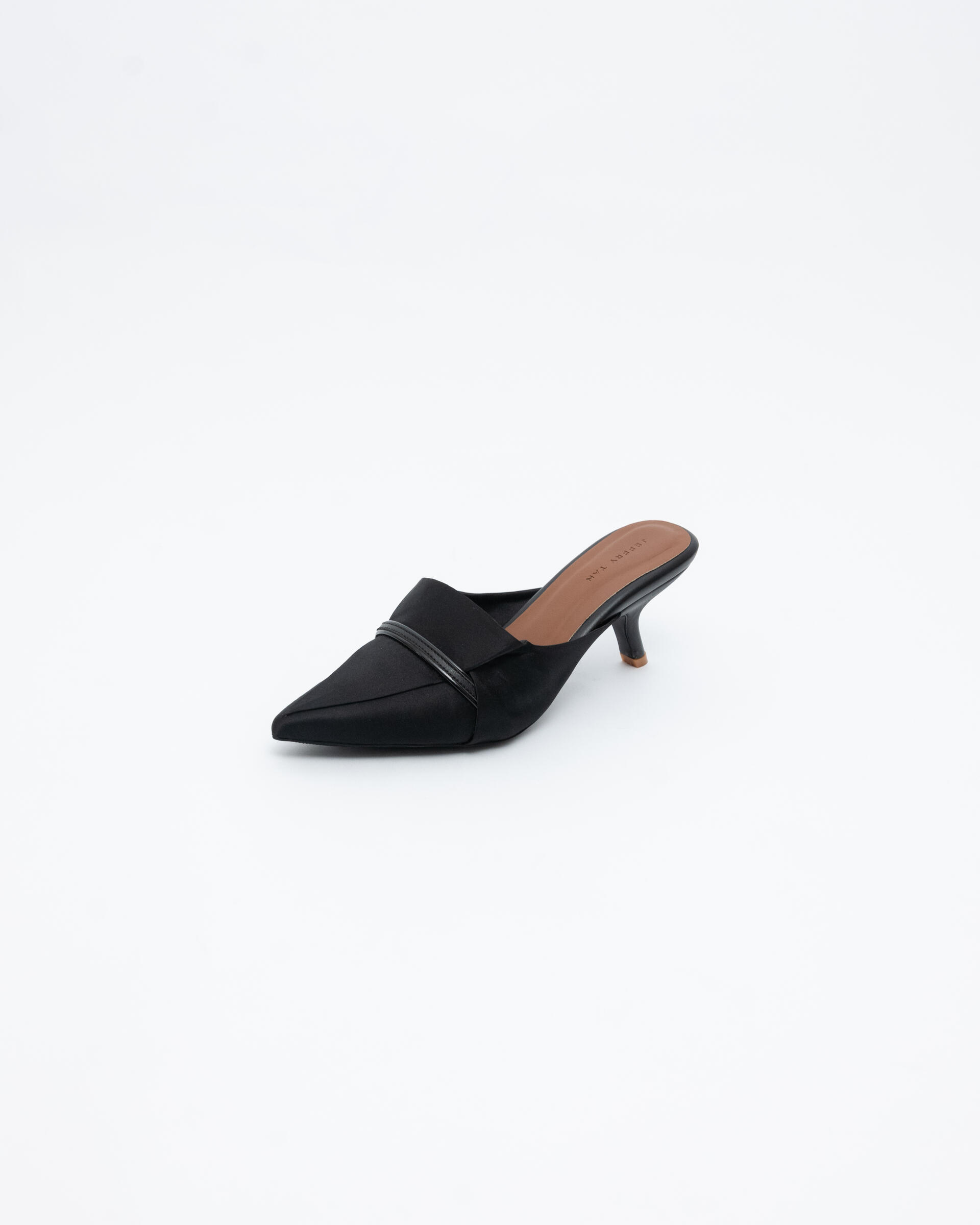 Classic point-toe shape sets in curved heels. Made from sublte glow satin with sculptural folds and mettalic straps.