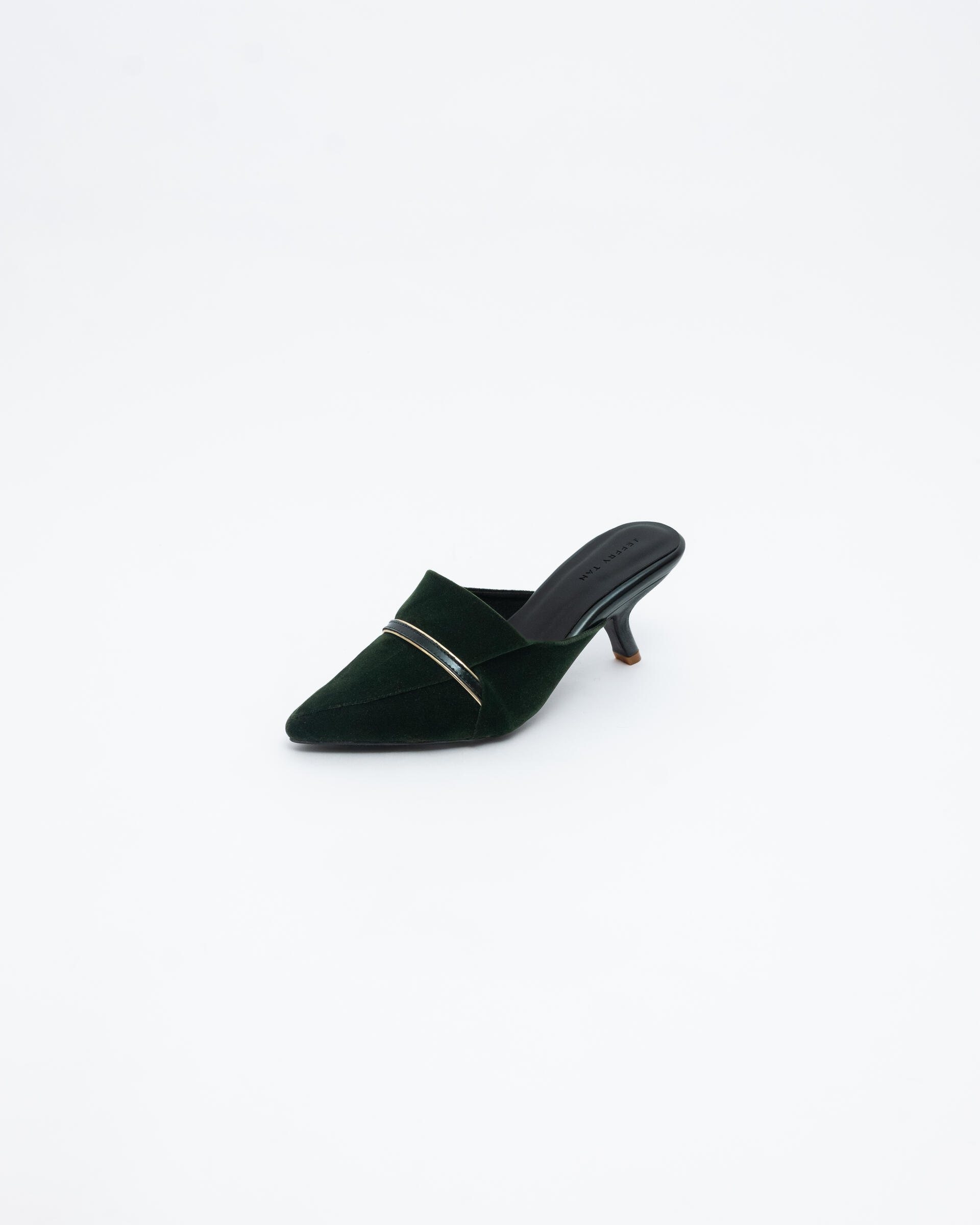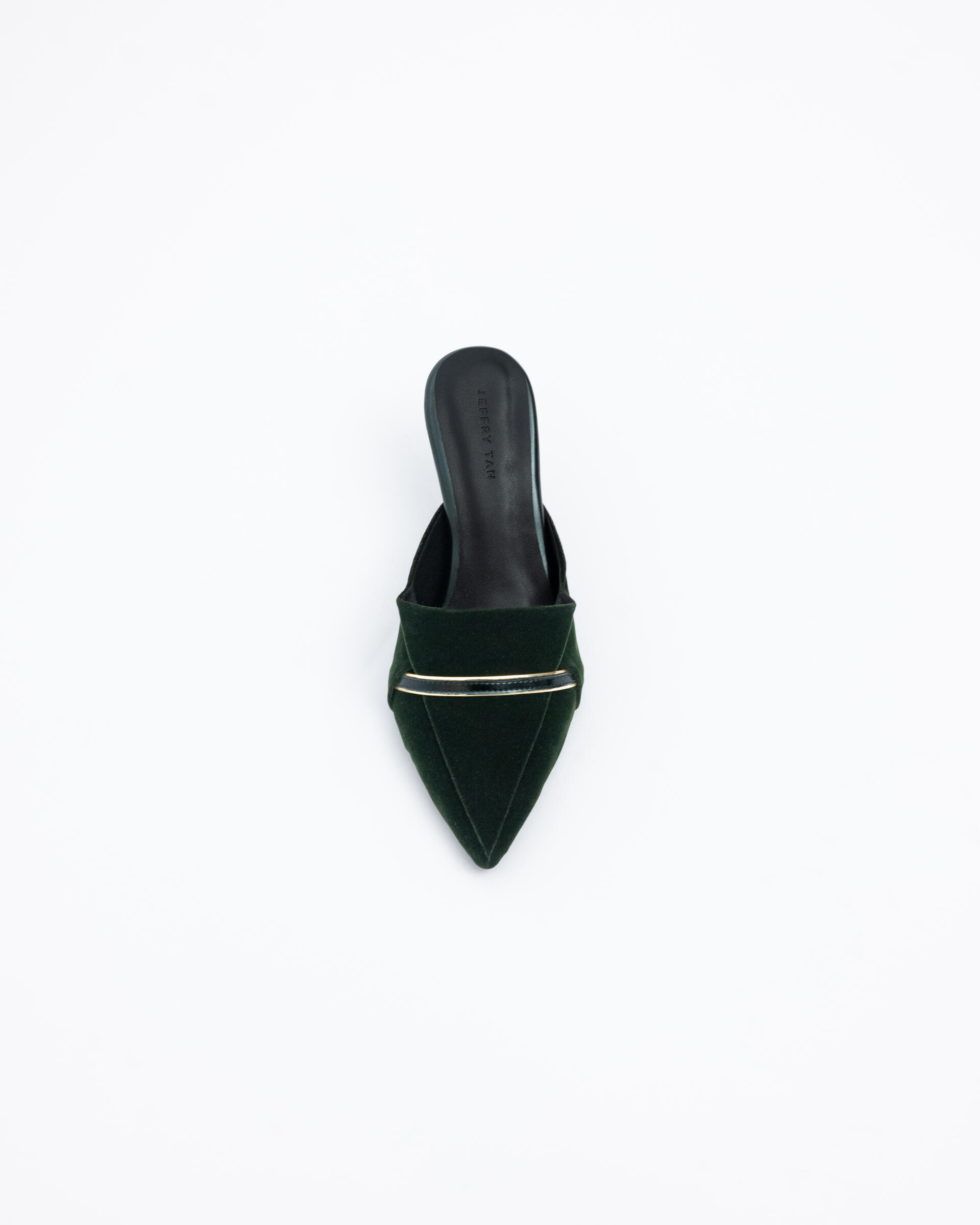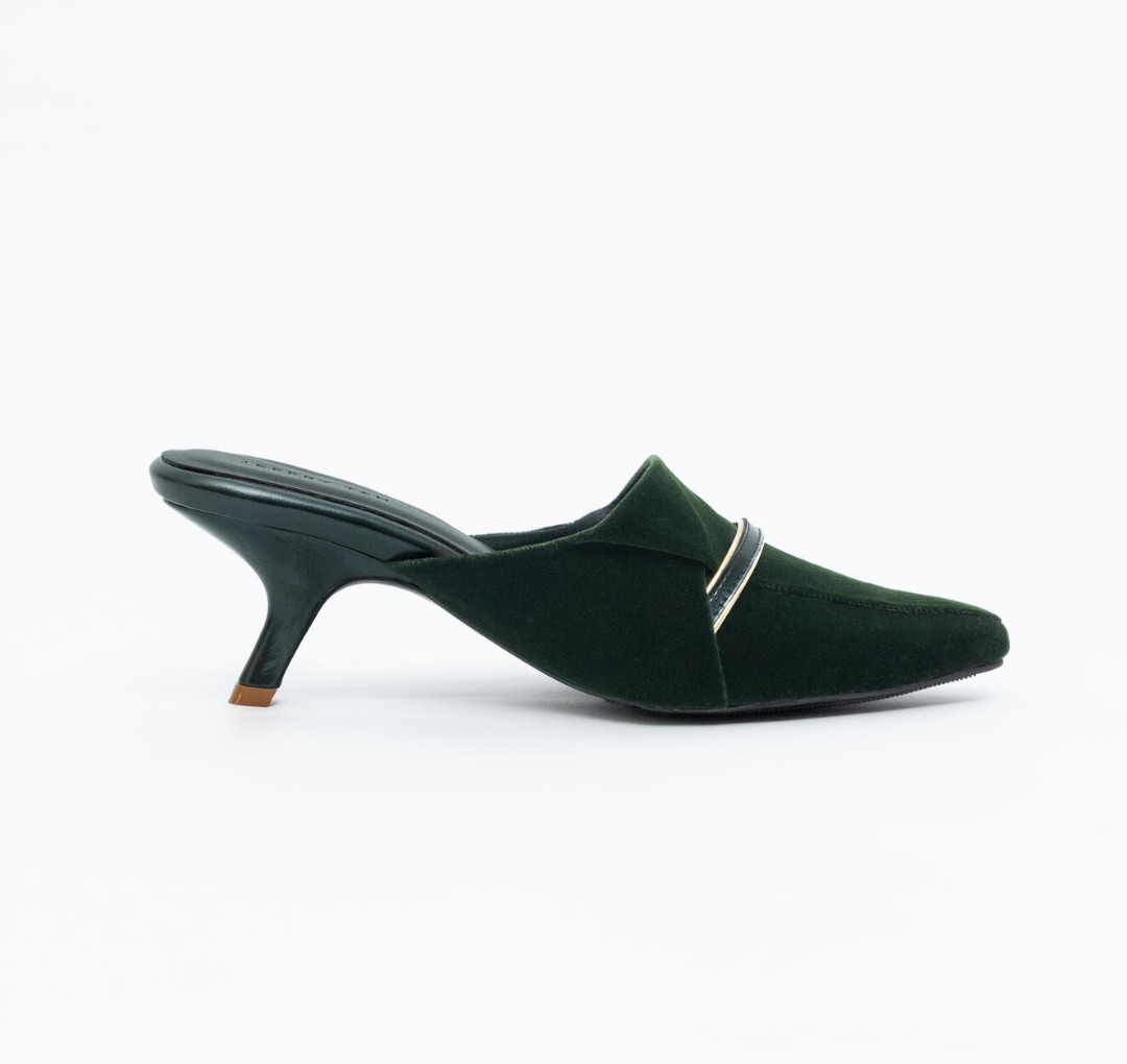 Classic point-toe mules sets in curved heels. Made from plush velvet with sculptural folds and mettalic straps.