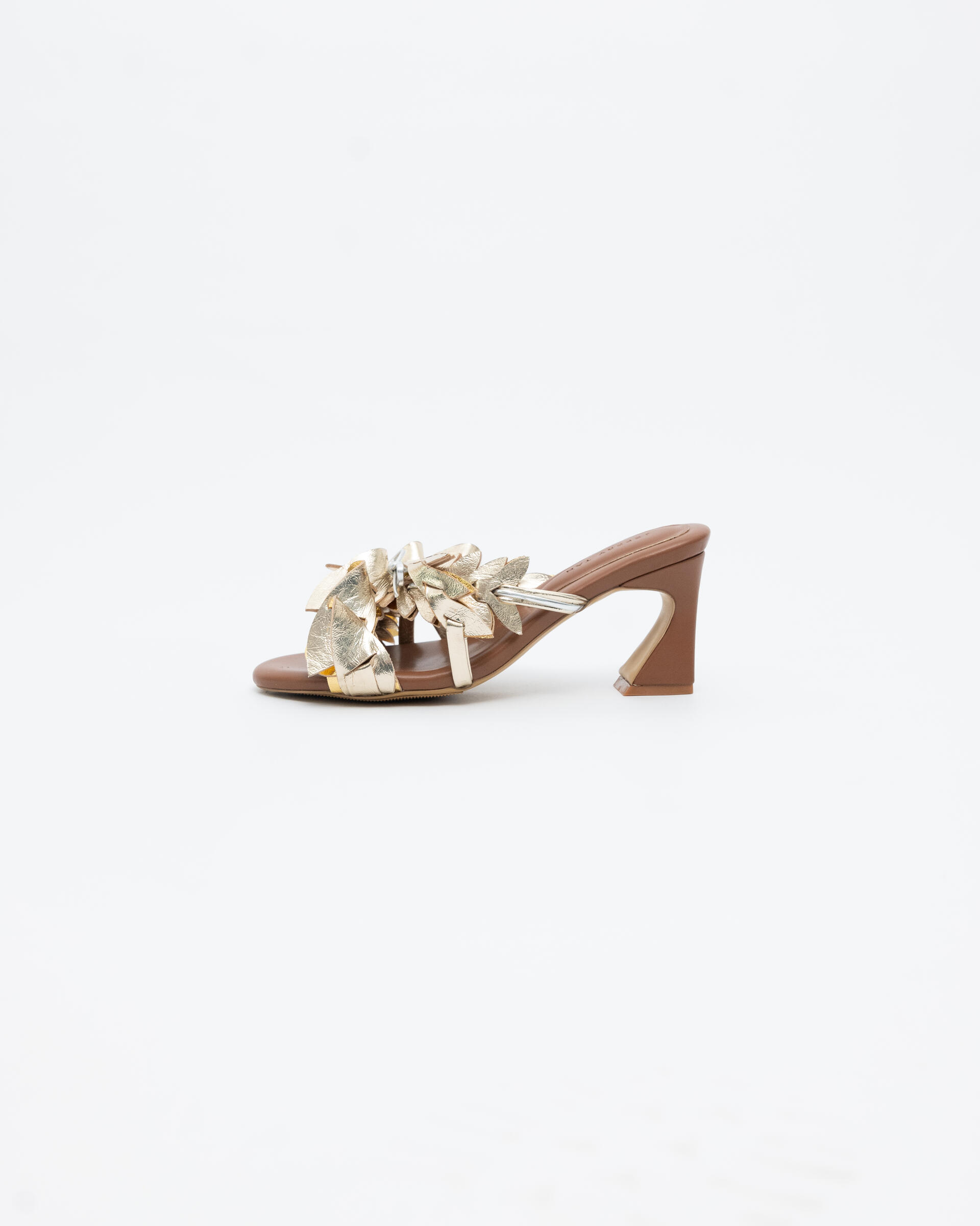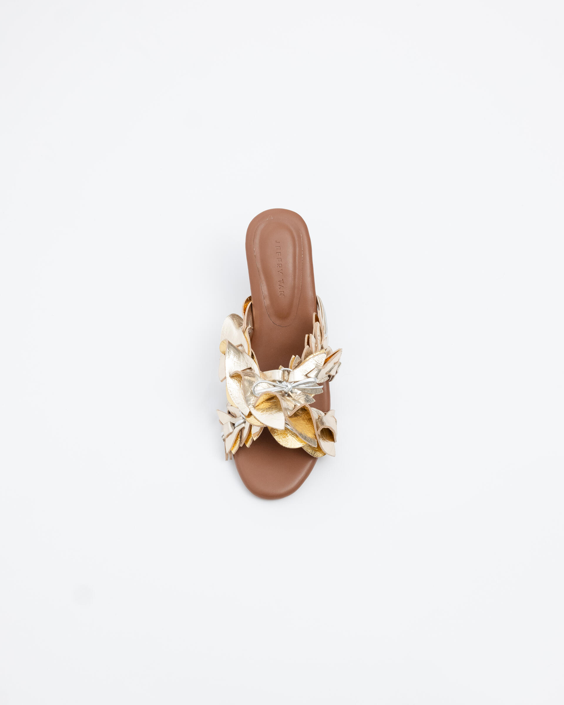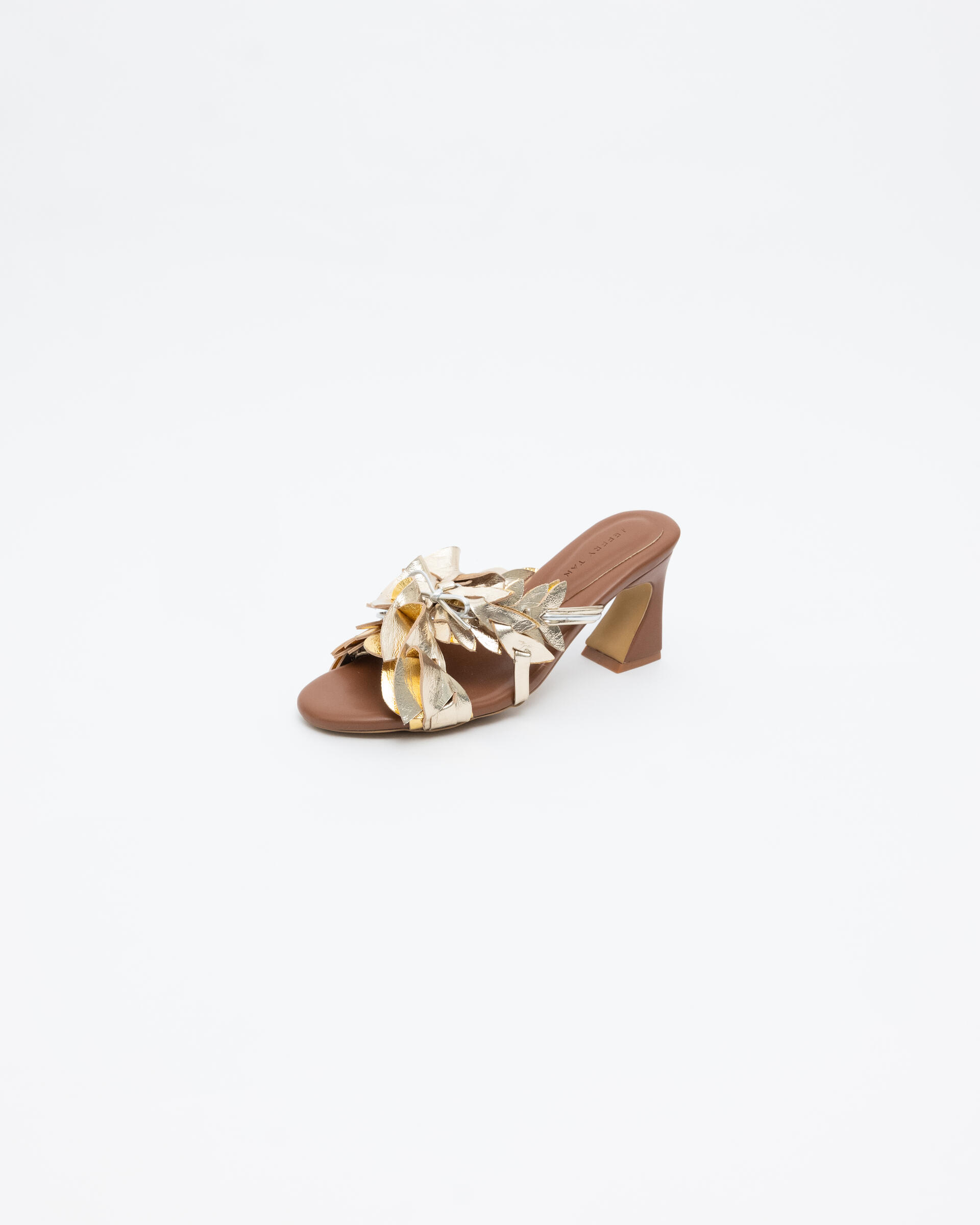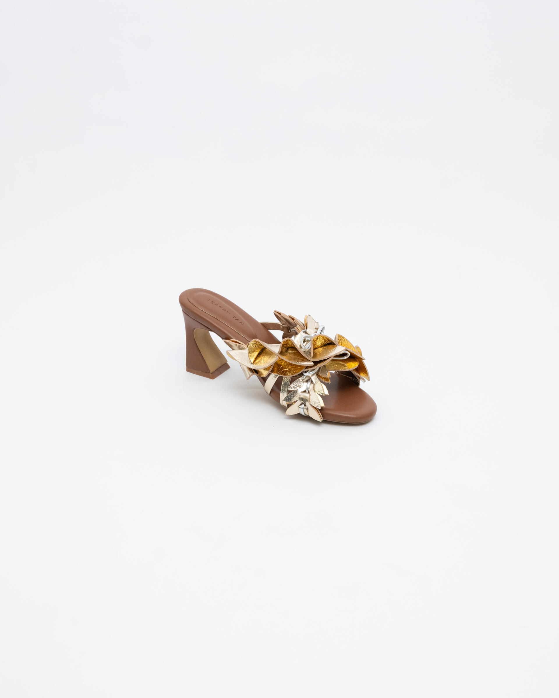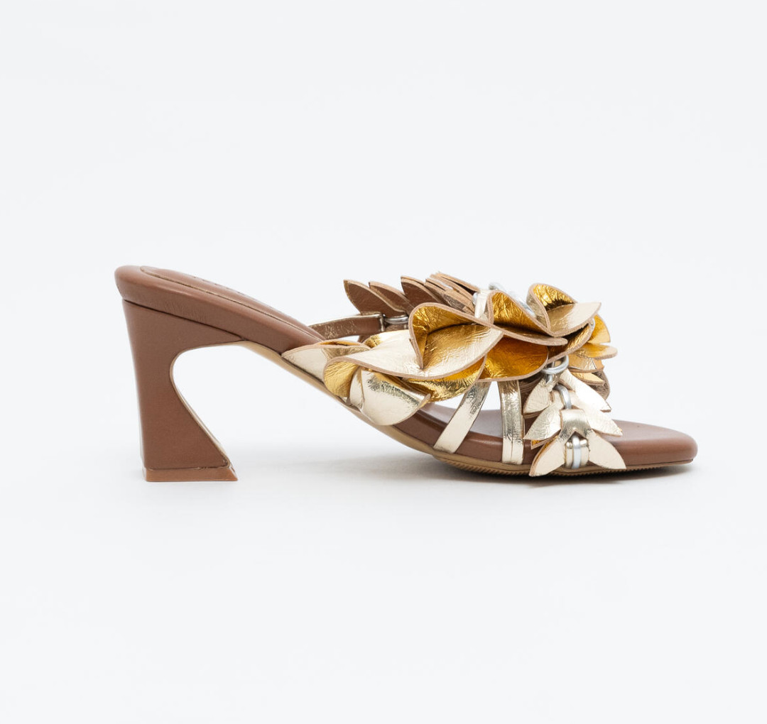 Slip on sandals with fluted heels. Explosion of floral and foliage embellishments made from two-tone hand cut faux leather panels