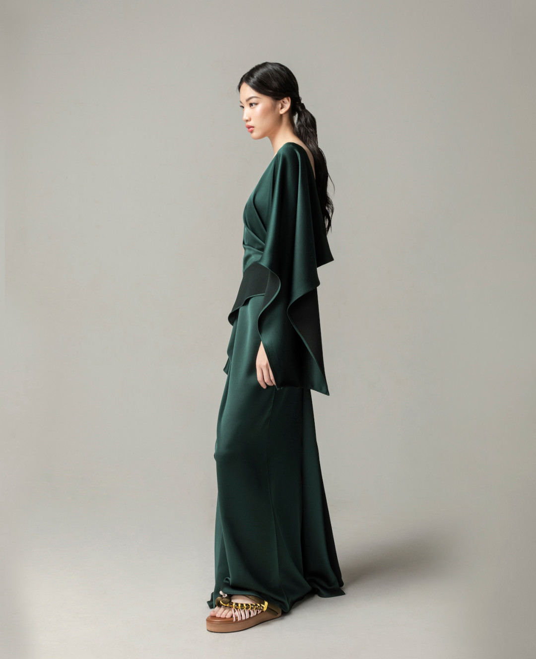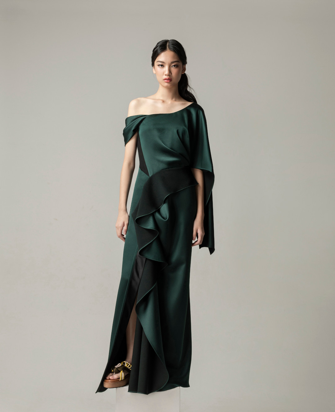 Making it an elegant choice for evening occasions. Designed with an off-shoulder neckline and fluid draping that softly contours the body, finished with a front slit for graceful movement. Style it with delicate heels and minimal accessories for a refined look.