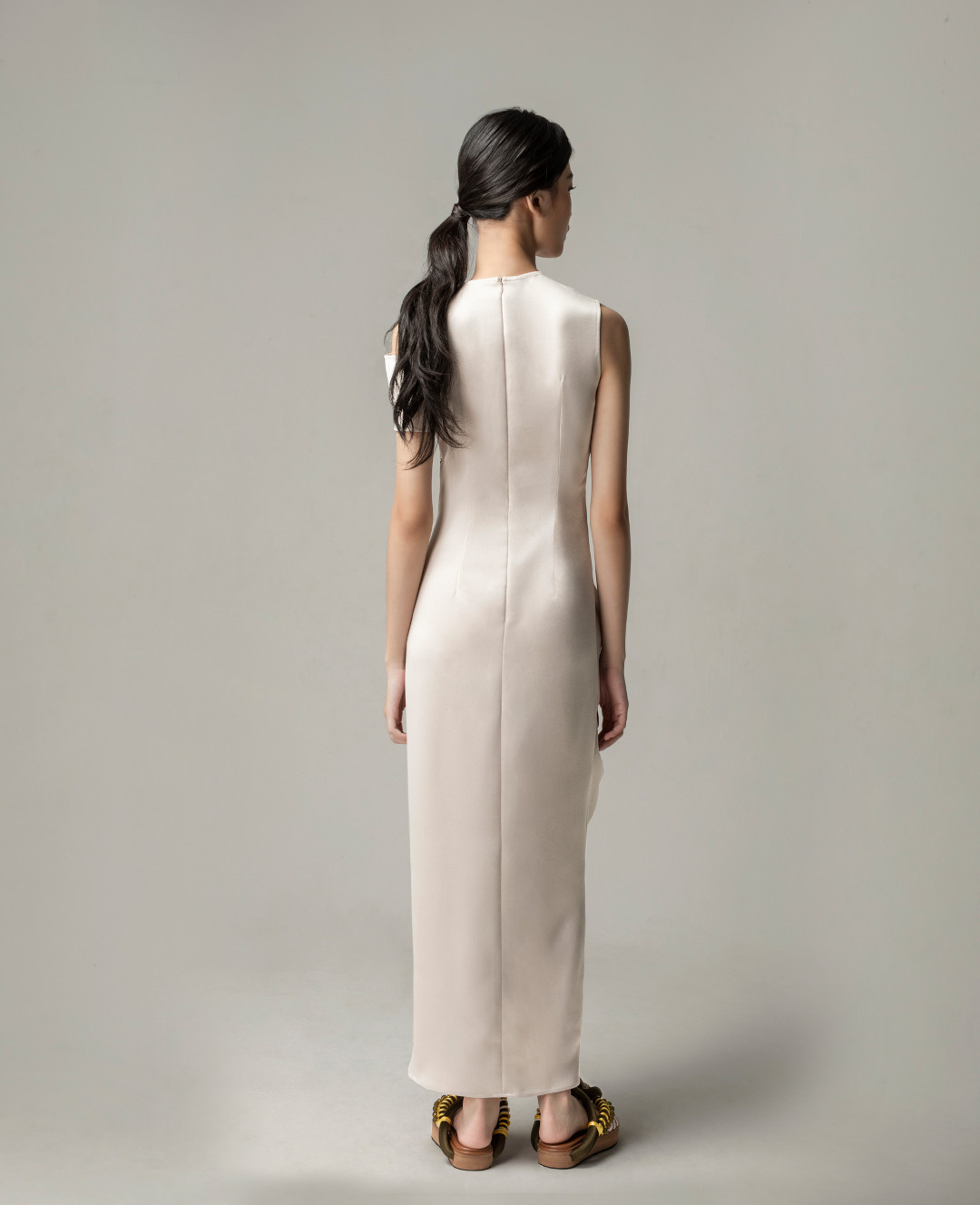An ivory cheongsam dress with a sleek silhouette, featuring an elegant asymmetrical drape and side slit that add a modern, graceful edge to the classic design.